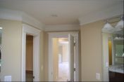 I ran into just such a situation today on a high-end new construction job. The carpenter had “built up” the molding by using a couple of inches of wall between the crown at the top along the ceiling and another cheaper piece of finish molding along the bottom edge (photo shows how it’s supposed to look). The idea was to make the finished unit (crown + wall + smaller molding — all painted trim color) look like a giant (read: expensive!) piece of crown molding. What happened was that the carpenter did not finish the edges at the doorway leaving wall space exposed. The painter then came along and, not having a finished piece of molding to serve as the starting point, he (or she) drew a LINE on the wall with a pencil and started painting wall color on the other side of it. Oh…my…gosh… and this was high-end construction??