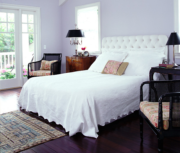 The other is a move toward a palette of soft sophisticated hues all in very light values and all the same value from room to room. The hues may include grays (very hot this year) but also gray greens, warm beiges, light taupe and lavender, and very soft delicate colors that almost defy description. These breathless tints are paired with lots of white and often dark floors, like the photo below of one of designer Chris Barrett’s fabulous bedrooms.