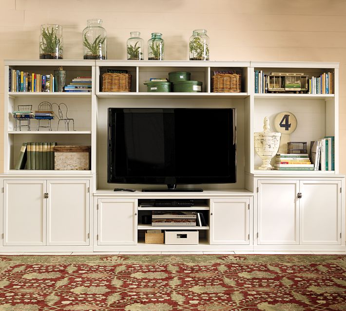 If you are trying to disguise your elephant in the living room, blend it. A black cabinet and other black accessories will help to camouflage the electronic “stuff of life” better than a white or light-colored cabinet will. See how the TV pops out of the white cabinet? And the bigger the TV, or course, the bigger the pop!