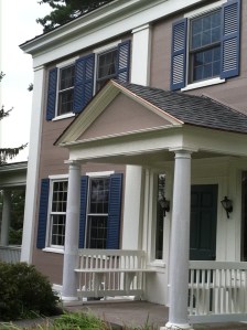 This house has a color combination I wanted to share with you. The taupe siding has the most interesting pink, almost purple, undertone that changes the way we see the house color depending on the light. The color can go from brown to mauve to gray over the course of the day. The trim is a combination of painted creams and vinyl off-whites (I wish they had picked one color or the other, honestly). But the real surprise (we’ll ignore the green front door) is the majestic blue shutter color. I would never think to pair the mauvey taupe with a royal blue but somehow it works. Black shutters would have been the easy choice, but someone had the bold idea to step out of the ordinary and into a new color combo. New to me anyway…