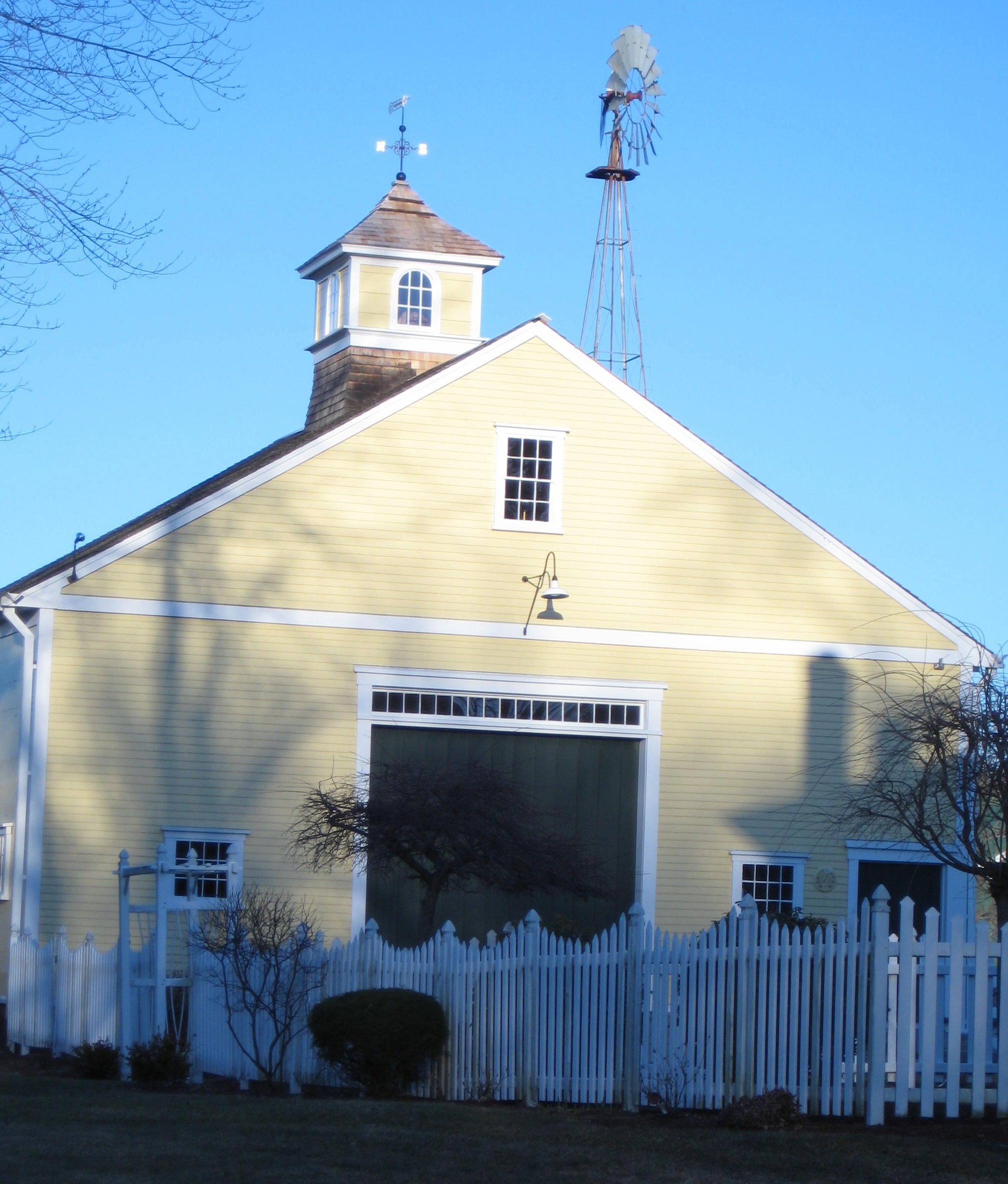 This yellow historic New England barn has lots of terrific architectural elements — cupula, weathervane, clerestory windows over the door, even a windmill in the back — but find the light fixture on this massive building! It’s the tiny white squiggle right above the big green barn door. Rats! A missed opportunity to finish this grand piece of history in style.