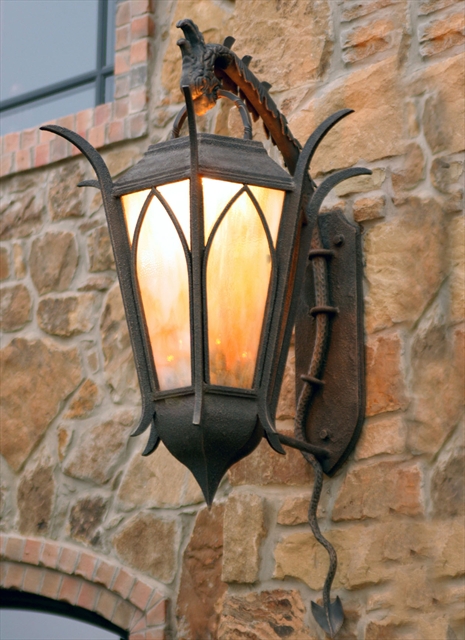 The light fixture pictured here is a Medieval Dragon Lantern from www.artisancraftedlighting.com and it really makes a statement. The scale of this lantern (it’s 51″ high and 32″ wide) fits its grand home. But even if you don’t live in a castle, your lights should be large enough to fit the scale of your door. Here’s the guideline: