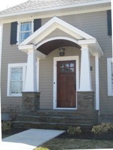 Say nothing of the new Arts & Crafts windows, textured roof, earthy natural taupe siding color, crisp white trim, and fresh landscaping, the entryway of this renovated colonial is a knock-out.