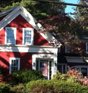 What makes this red, white, and blue color scheme work so perfectly is the balance of color between the candy-apple-red siding and the creamy white trim. Notice on the flag hanging on the door that, for the most part, neither the red nor the white stripes dominate. Both colors balance each other. That same effect is evident on this house — the exceptionally wide trim painted a soft cream keeps the red from overpowering the house. Just like the flag, the house is balanced.