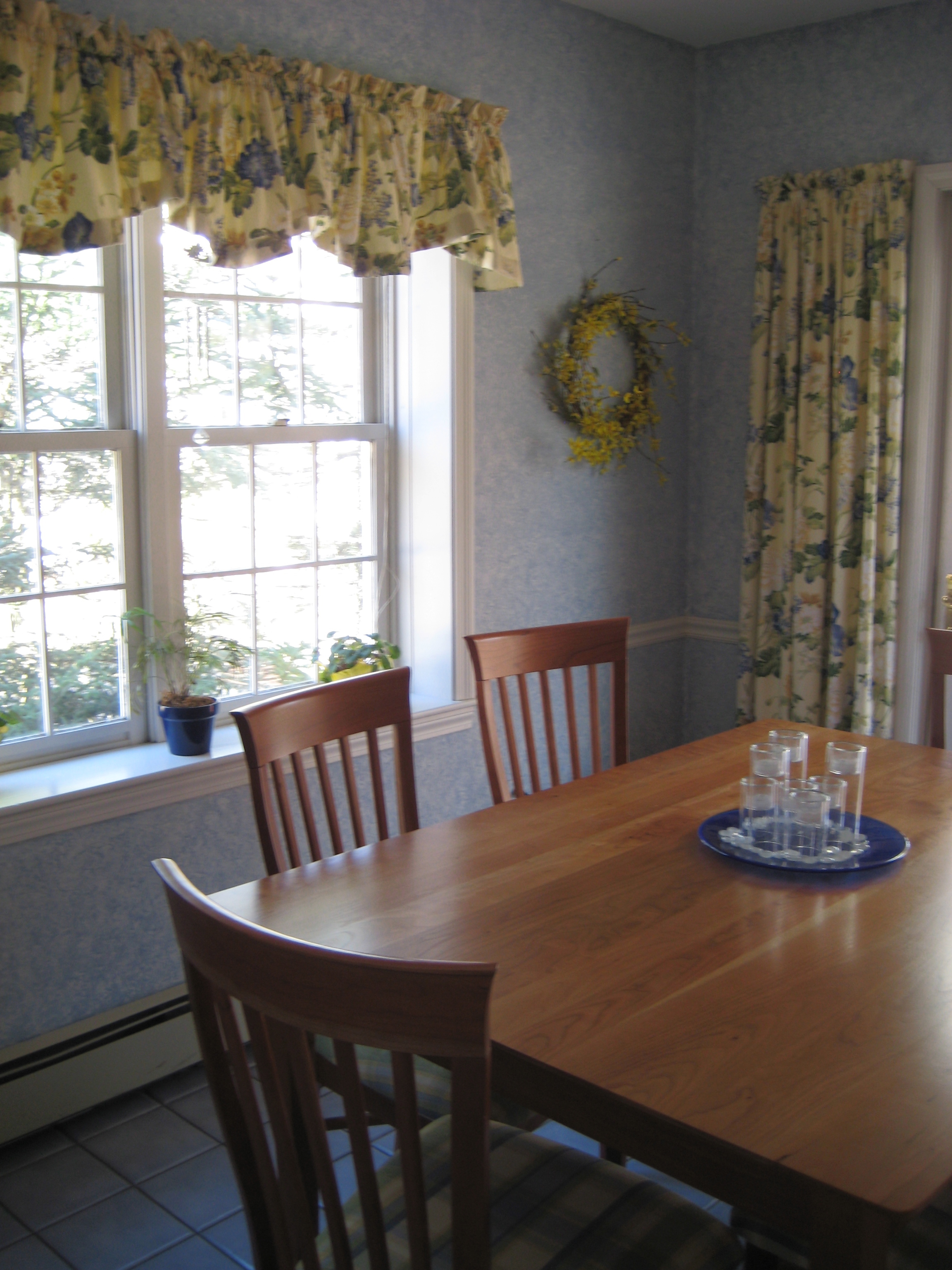 This homeowner opted for new appliances — all stainless — to replace the ones original to the house. Then we replaced the white Formica countertop with Blue Pearl granite to coordinate with the blue tile floor (staying). The faux finish was primed over with a light yellow paint color that came from the background color on the fabric window panels. The cabinets got new nickel knobs to replace the brass. Countertop appliances and knick-knacks were stored to feature the new granite.