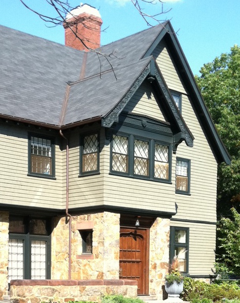 Knowing the homeowners did not really like their roof (chosen by previous owners), I offered a couple of paint color options that would coordinate the siding with the roof. Contrasting the siding color with the roof would have made the roof pop off the house– not something the homeowners wanted. (When you’re trying to camouflage something, think blending.) I gave them Mayflower Red (Benjamin Moore HC-49) and Maryville Brown HC-75.