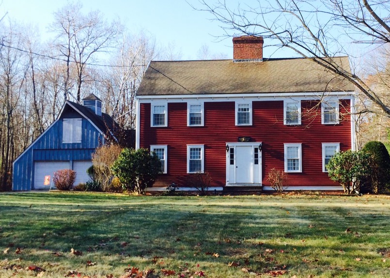 I always love a tastefully done red-white-and-blue scheme, shown here with a blue garage attached to the red house. White (Ben Moore’s Brilliant White) as both trim and accent color pulls the look together.