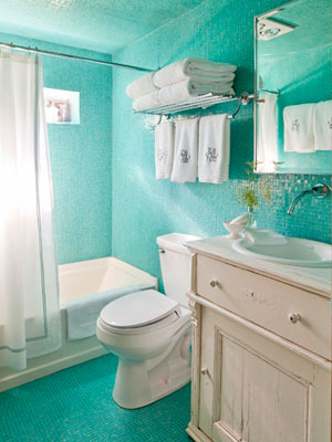 If you have ANY plans to sell your home within the next, say, 10 years, I do not recommend dipping your bathroom in a vat of mosaic glass tiles. I know they are stunningly effervescent especially in cool swimming pool shades of blues and greens, but my gut tells me that the extreme application of almost any material will become the “avocado green” of the next generation of home buyers.