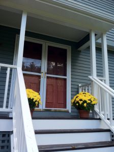 Look carefully at the colors around the pond and you will find your accent colors. Autumn red for the door, dark woody brown for the front step treads, crisp cloud white for the trim, and pops of golden yellow for your flower pots.